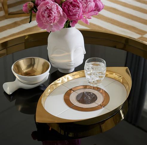 Back painted glass set in a peeper-shaped polished brass frame?an eye-conic expression of 70s inspired glamour featuring notes from our intoxicating Chambeige palette. Think Halston, think Studio 54, think Egon von F?rstenberg?totally 70s, totally today. Corral your prized possessions or host an attention-getting afternoon tea.