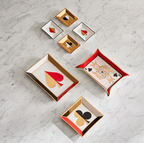 All bets are on. From Diana Vreeland’s iconic red room to the storied extravagance of Monte-Carlo, playing card motifs have always signified jet set glamour. Our Dealer’s Choice trays and catchalls are an easy way to express your love for a life of luxe leisure. Crafted from high-fired porcelain and treated to a bold black, white, red and sparkly real gold palette that cranks the ante up on glamour. Packaged in bow-ready gift boxes, our trays make the perfect hostess present (or pick-me-up for yourself).