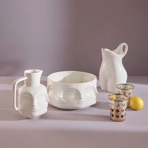 Jonathan sculpts and throws the models for our Muse pottery and then substitutes our signature geometric relief patterns with body parts?faces, breasts, lips?to create a surreal style. Pieces are inspired by our favorite artists’ muses.