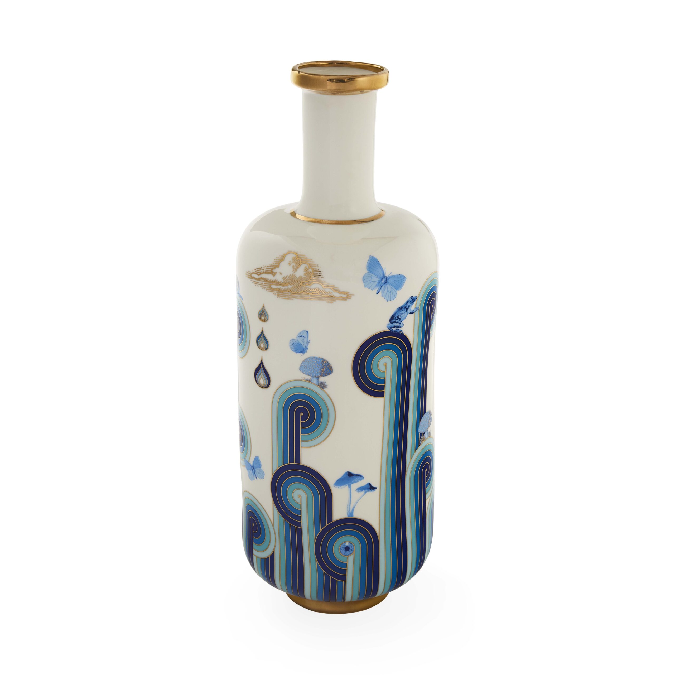 Expand your horizons with dreamy third-eye mindscapes rendered in Delft-inspired blues and accented with real sparkly gold. High-fired porcelain elevates the experience. Our Druggist Tall Bottle Vase features a wraparound design?rotate to refresh your view. A surreal addition to your table, shelf, or mantel. Style it with our other Druggist pottery and create your own dreamscape.