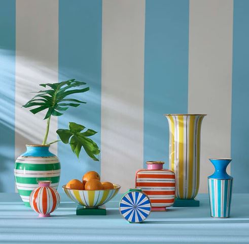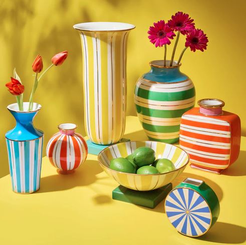 It?s true: stripes are forever and a pop of playful color is posh, posh, POSH. Our Portofino vessels are crafted from high-fired porcelain, wrapped in bright candy-colored stripes, and treated to a glossy finish. Available in a variety of classic silhouettes, there?s a size and shape for every tablescape. Pop them in a neutral room for a jolt of jet set joie de vivre, or layer them into an already-bold abode.