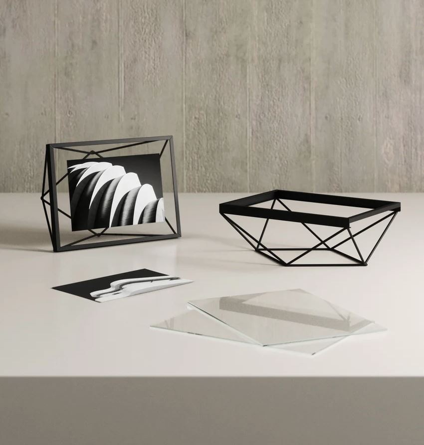 Prisma is a contemporary, unique geometric frame, with slim wiring, that seamlessly contours the chosen image, drawing, illustration, or graphic text. Resting comfortably between two sturdy panes of glass, the frame creates a floating effect and adds a degree of dimension and depth. The wires can be seen through the front of the frame, allowing for an ultra-modern display. Prisma frame can be oriented in a multitude of arrangements, including hanging or sitting, vertical or horizontal, and placed on a table or mounted on the wall. This prismatic wire frame can be easily integrated into any style of décor.