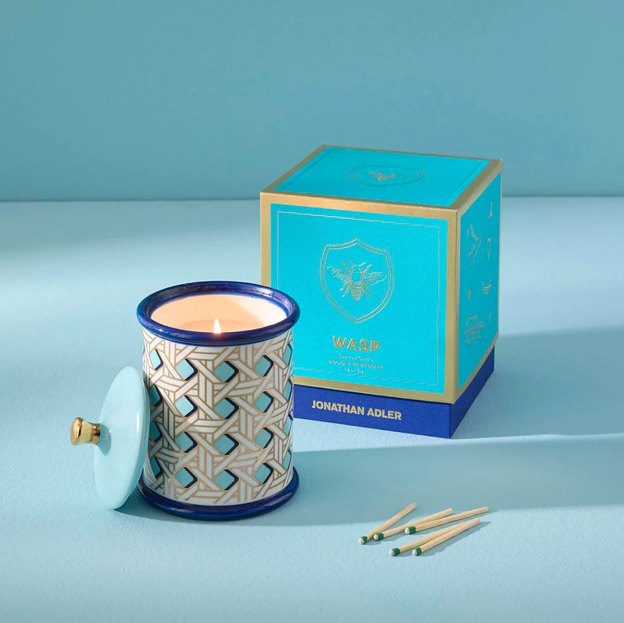 Gilded Wasp candle is poured into a high-fired porcelain canister wrapped in classic Palm Beach caning accented with glimmering gold and finished with a glossy glaze. Topped with a removable lid, it’s the perfect vessel for stashing your secrets after the candle has burnt out. Packaged in a bow-ready box for gifting (and storing).